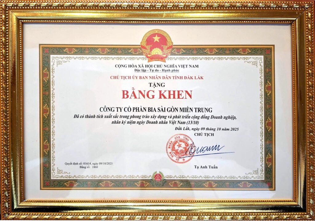 Công ty Cổ phần Bia Sài Gòn – Miền Trung đã được UBND tỉnh Đắk Lắk trao tặng bằng khen Tập thể và cá nhân có thành tích xuất sắc trong phong trào xây dựng và phát triển cộng đồng Doanh nghiệp
